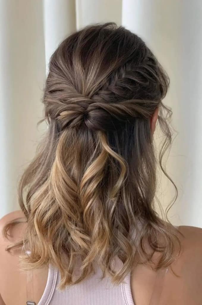A fishtail braid adds an intricate detail to a half-up hairstyle.