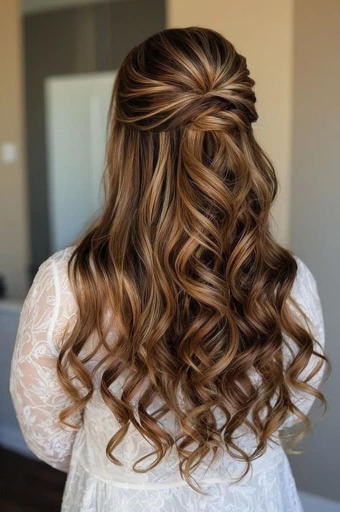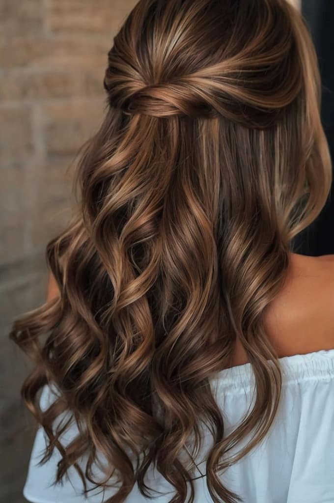 Styling Tip: Curl your hair softly and pin it elegantly into a low bun.