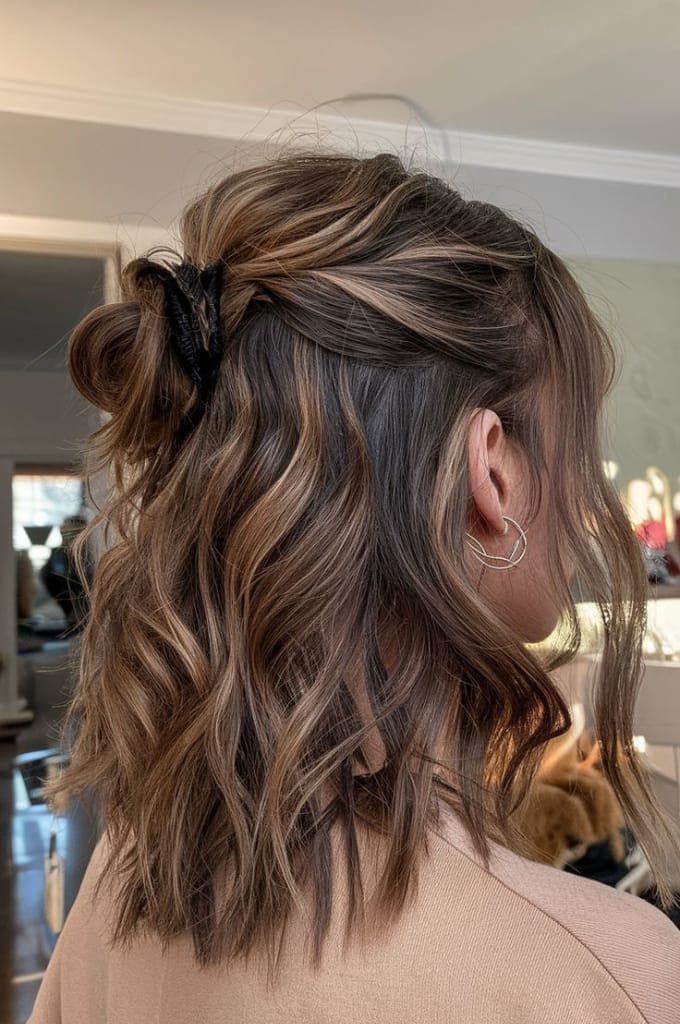 Embrace an effortless vibe with a messy top knot that lets soft, cascading locks escape for a playful touch.
